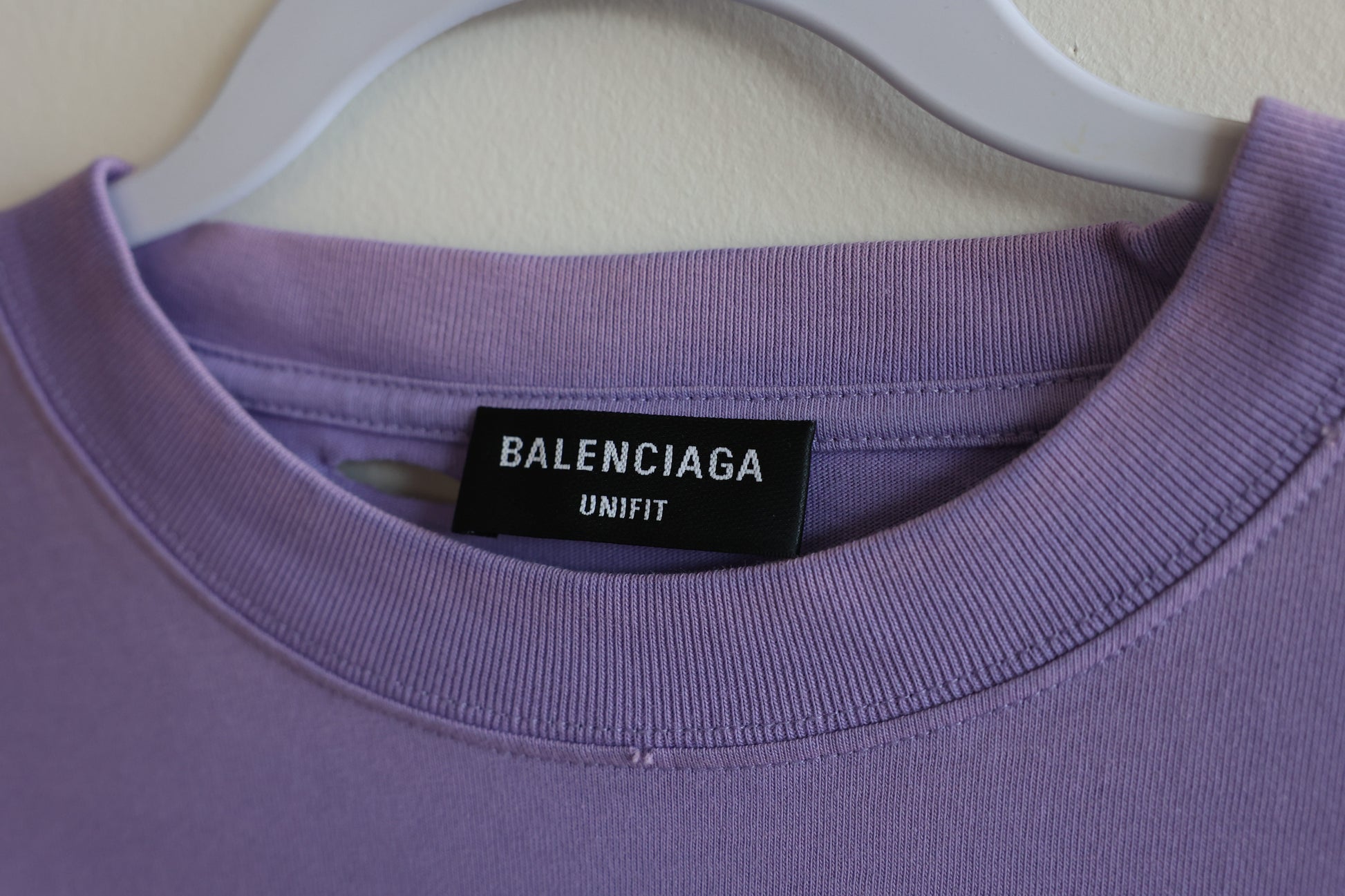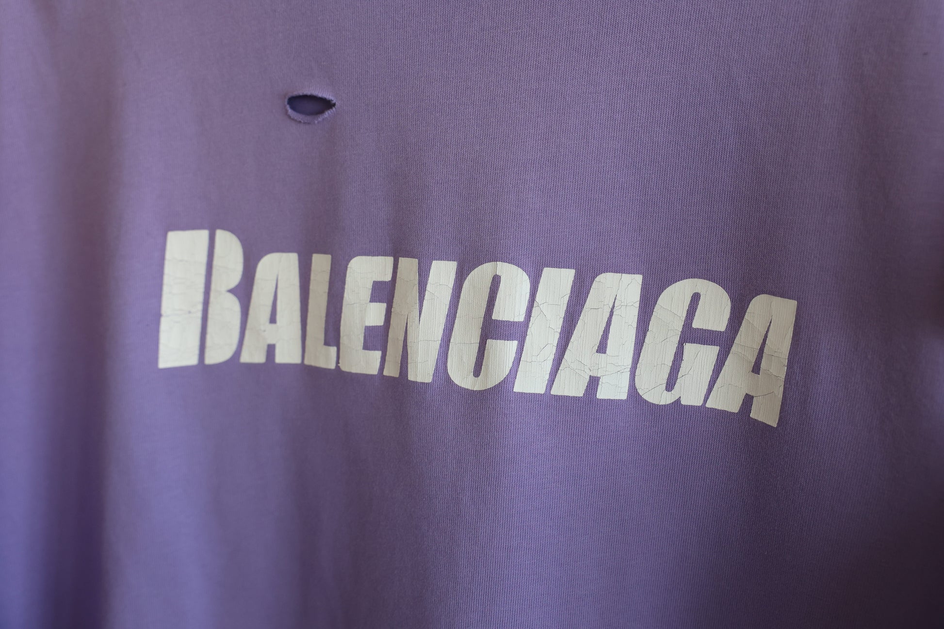Details: Light purple distressed T-shirt with distressed white Balanciaga logo, unisex