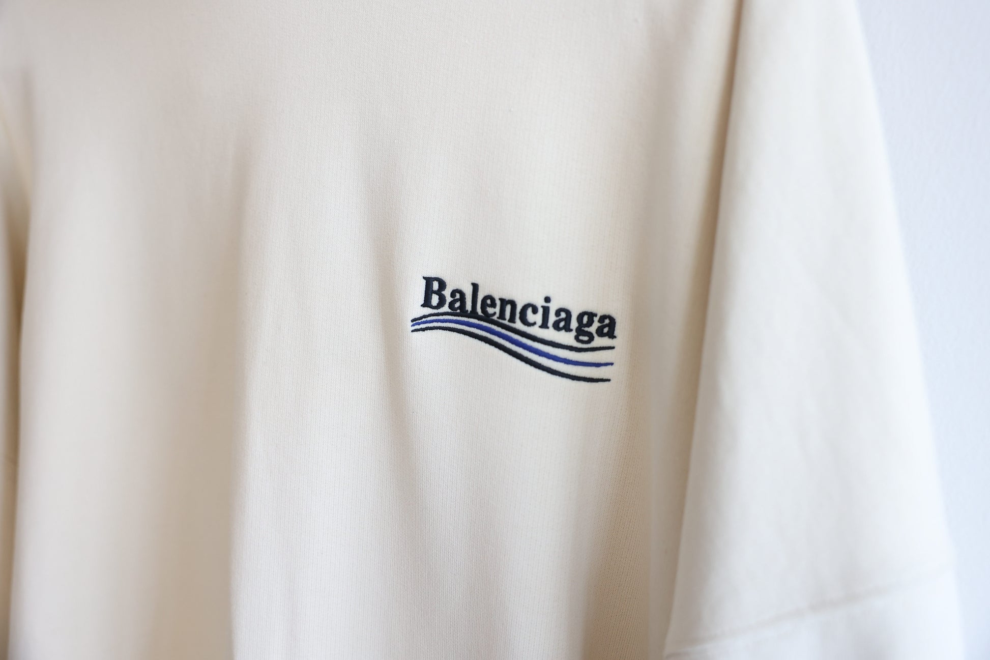 Details: Cream cotton hoodie with embroidered political campaign Balenciaga logo on front and back
