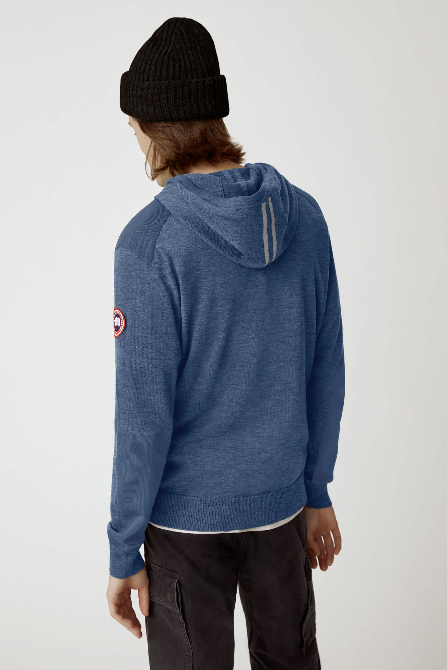 Details: Blue knit hoodie with regular red Canada Goose logo on arm, reflective stripes on hood